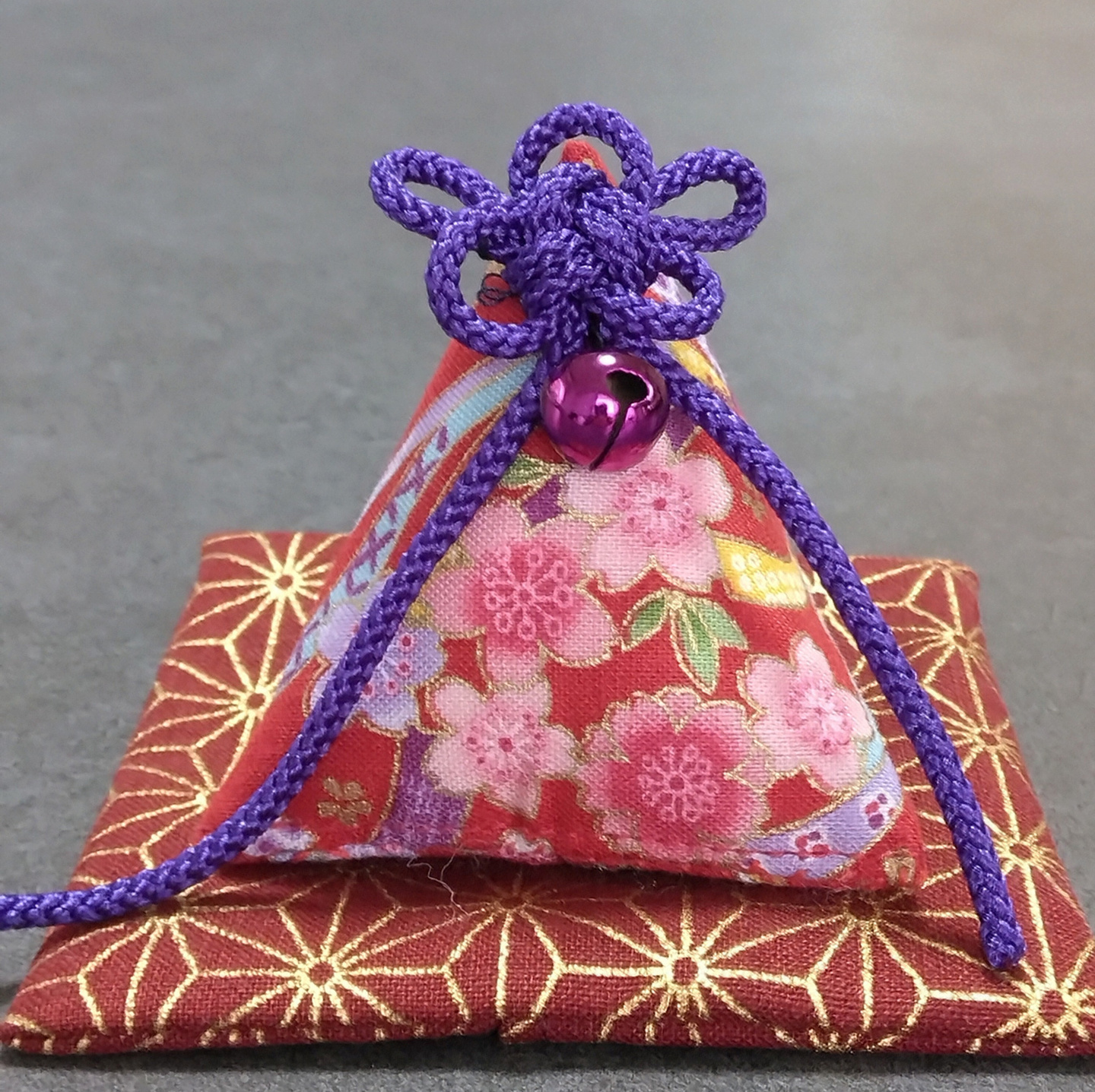 三角錐御守り(りぼん・赤) ~ 御守りと座布団のセット(ケース入り) ~御守り本体のサイズは、約 幅6cm×高さ6cmです。本体の中には厄除けの訶子の実が入っています。座布団には白檀香ベースのお香が入っています。盛り塩代わりの御守りやインテリアとしてお飾りください。 2,200円(税込) >商品一覧へ
